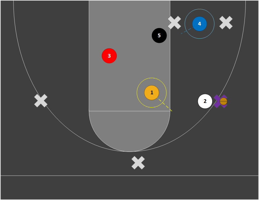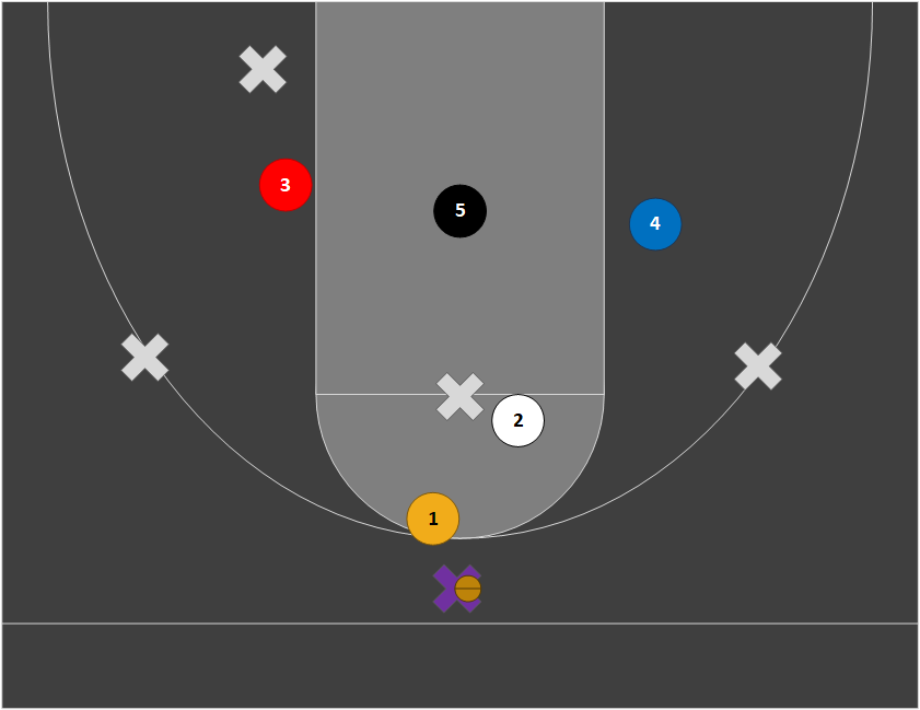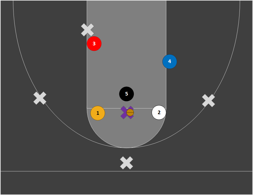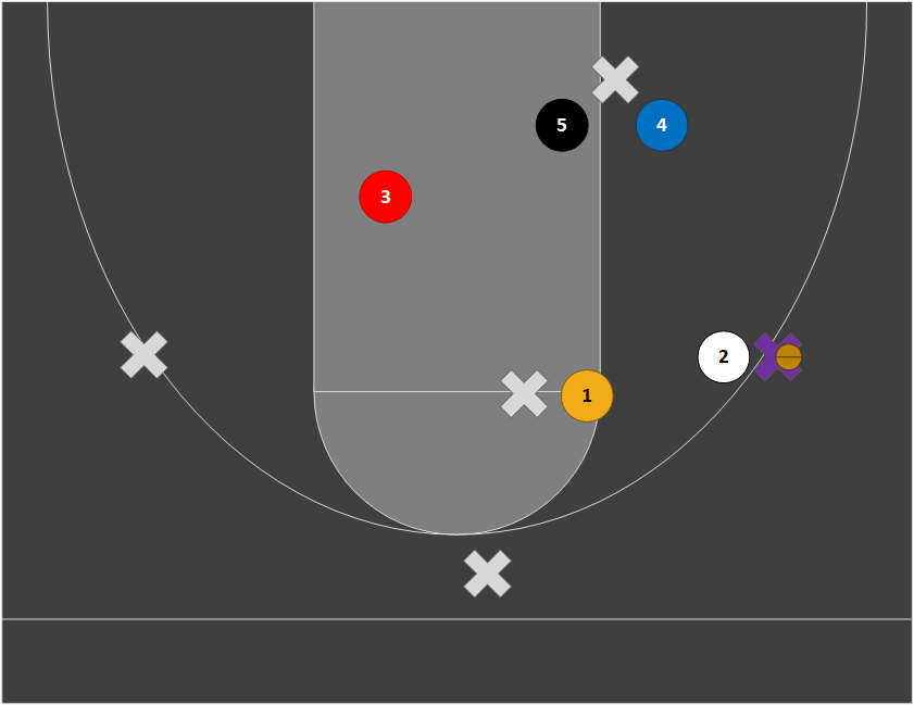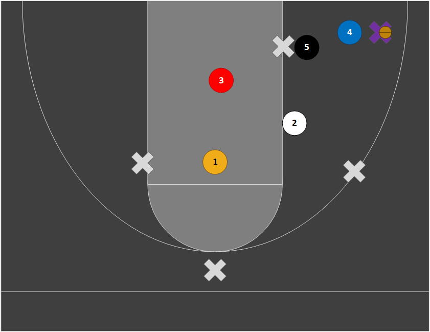 Our zone defense requires similar positioning and effort to our pack line (base) defense. The pictures below show how players should guard their man based on where the ball is located in a 2-3 zone. Positioning flips if the ball goes to the left side.